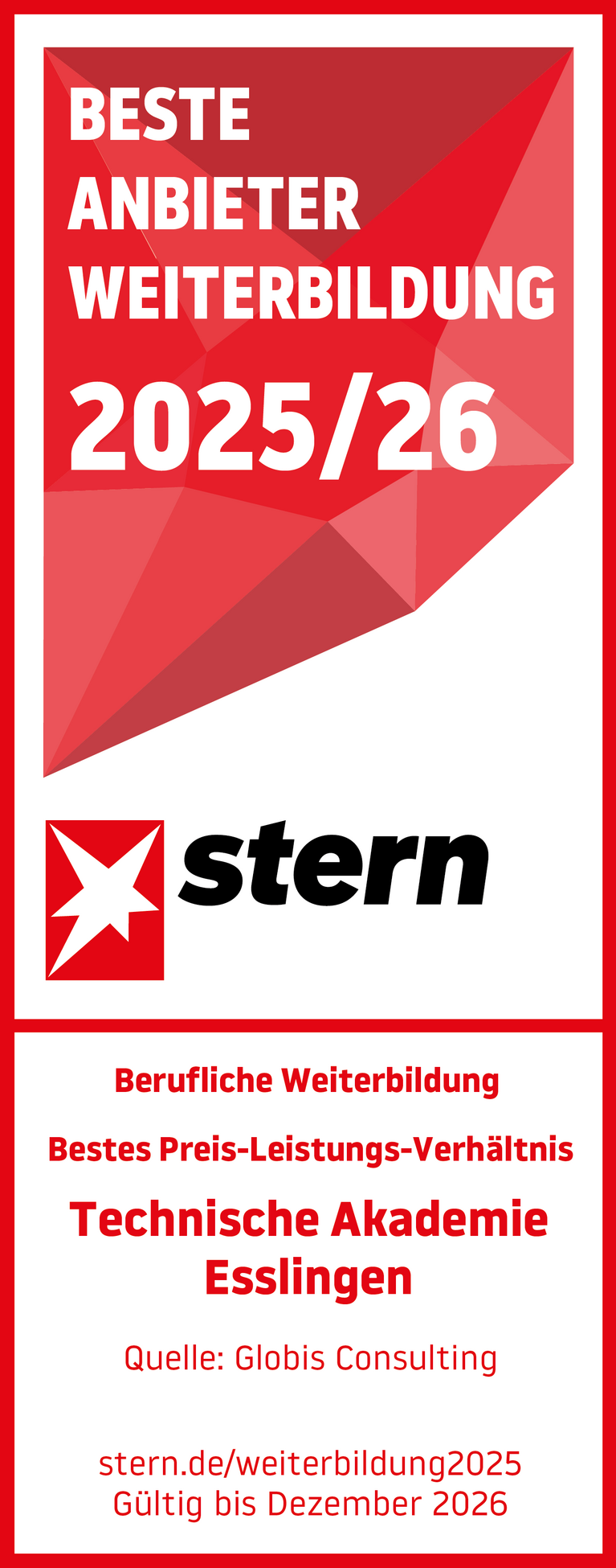 Die Technische Akademie Esslingen (TAE) wurde erneut als einer der führenden Weiterbildungsanbieter in Deutschland ausgezeichnet. Nach der jüngsten Ehrung bestätigt nun auch die Auszeichnung des Stern die hohe Qualität unserer Angebote – und damit zum zweiten Mal in kurzer Zeit die Zufriedenheit unserer Kundinnen und Kunden.
